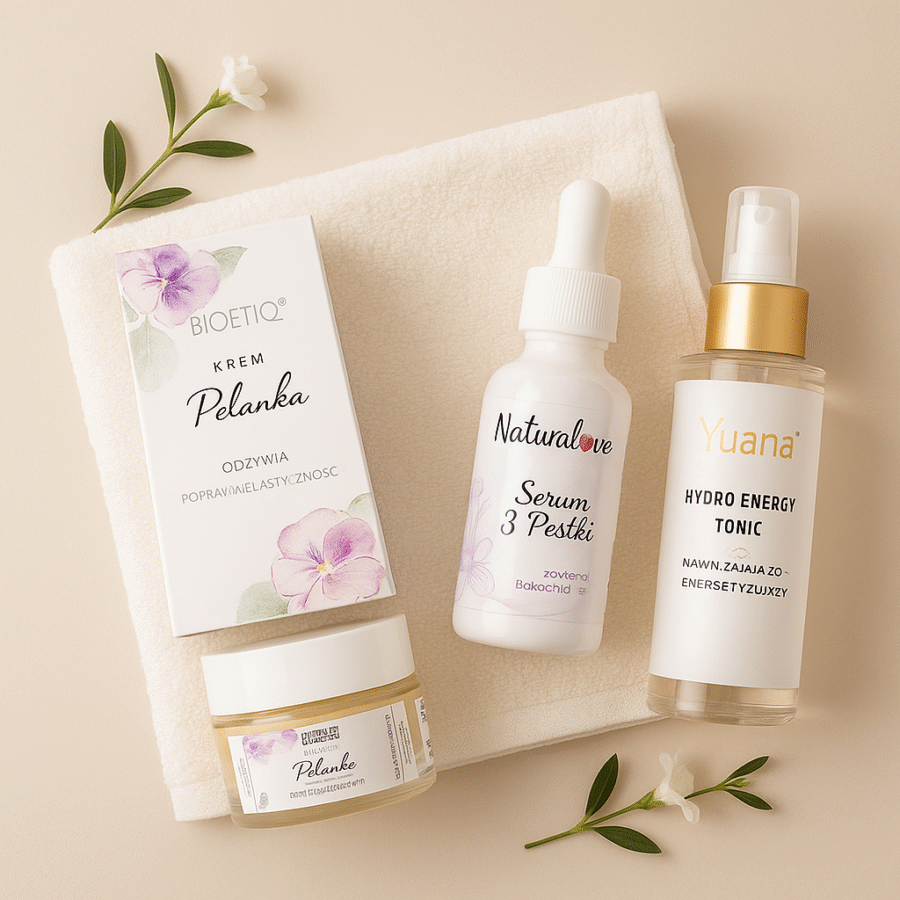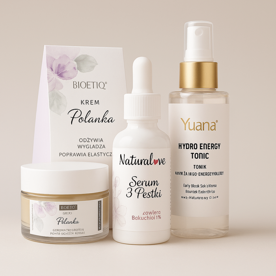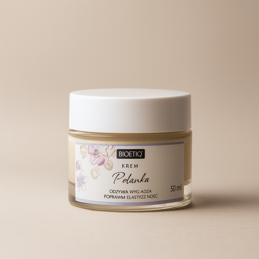- Krem Bioetiq Polanka: potrójny kwas hialuronowy, fitokolagen, Q10, witamina C, witamina E, olej z opuncji – nawilżenie, rozświetlenie, elastyczność, ochrona.