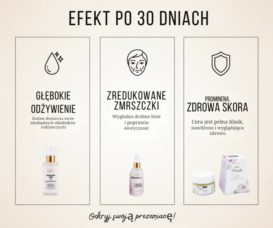 Dla kobiet 40–65+ z cerą suchą, odwodnioną, wiotką lub wymagającą odnowy i odżywienia. Efektów może dostarczyć właśnie kompleksowa pielęgnacja oferowana przez ten zestaw.