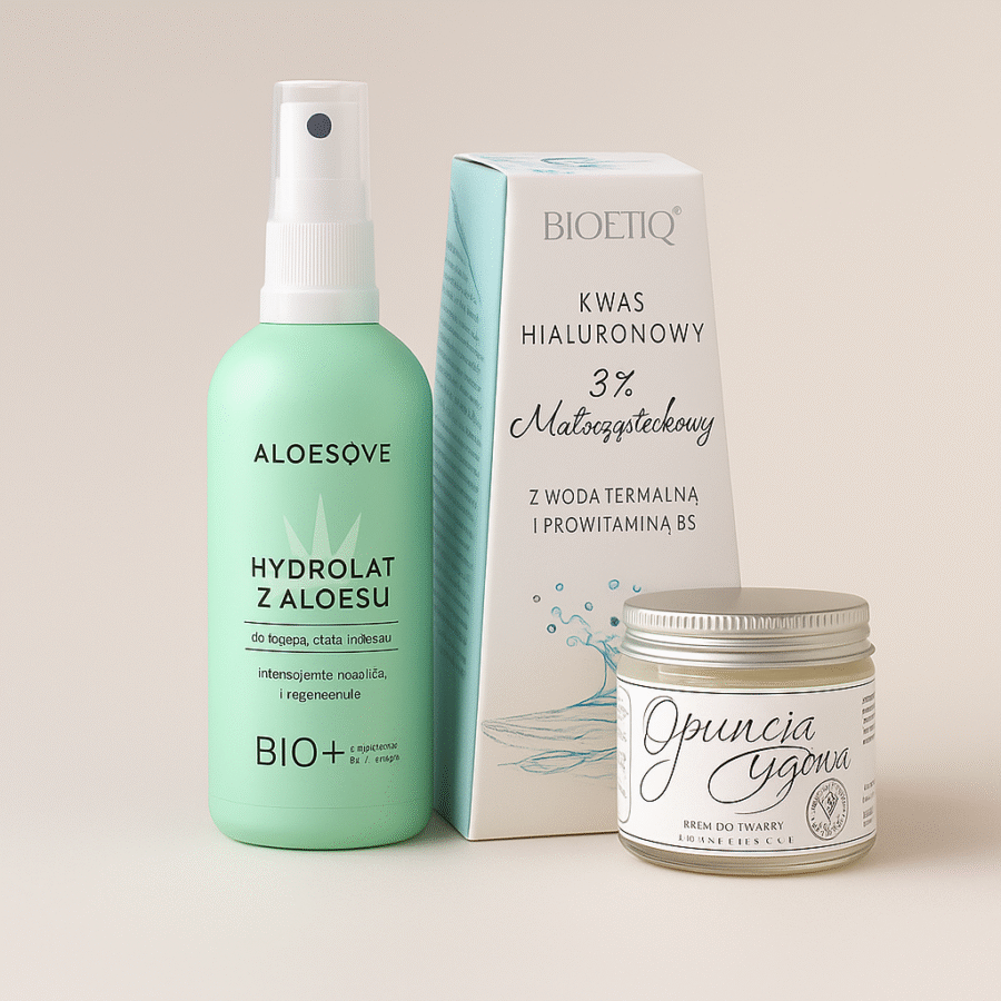 Zawartość zestawu: Hydrolat z aloesu 100 ml + HA 3% BIOETIQ 30 ml + Krem Opuncja & Q10 60 ml.