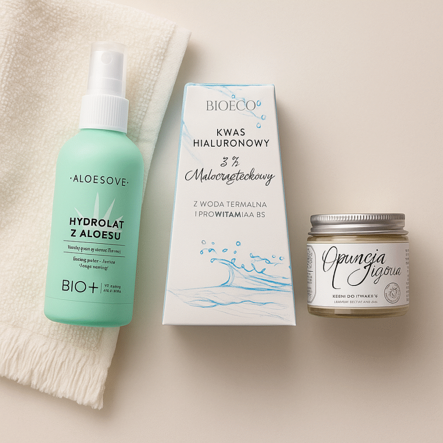 WIECZÓR: hydrolat (mgiełka) → serum HA 3% na lekko wilgotną skórę → krem Opuncja & Q10 (możesz nałożyć grubszą warstwę jak maskę).