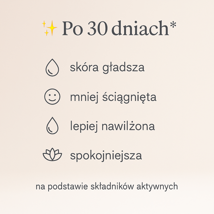 Skóra 40–65+, sucha lub wrażliwa, z utratą sprężystości, drobnymi liniami i zmęczonym kolorytem; świetny wybór również w peri/menopauzie.